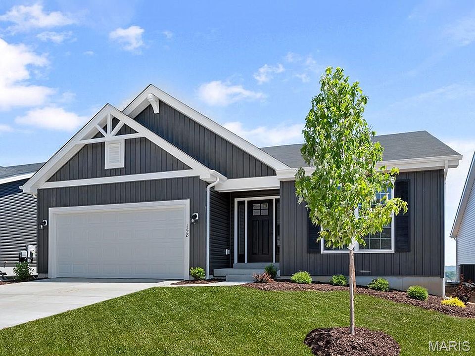 McBride Homes’ Aspen II 3BR, 2BA ranch-style home ready this winter! Farmhouse exterior & walkout homesite! Enjoy an open floorplan with vaulted ceilings, 6ft windows, & beautiful wood laminate flooring in main living areas. The kitchen has a large island with a breakfast bar, level 4 Brellin White 42” cabinets, quartz countertops, stainless steel GE appliances, & large walk-in pantry. The dining area has a sliding glass door that leads to a future covered patio area with a ceiling fan prewire. The primary suite has a large window, dual closets, & private bath with double sinks & walk-in shower. Other extras include main floor laundry, ¾ bath rough in at LL, upgraded lighting/plumbing fixtures, six panel white interior doors, plus garage coach lights. This community features 105 total homesites with several cul-de-sac homesites and sits adjacent to Koch Park. Enjoy peace of mind with McBride Homes’ 10 year builders warranty & incredible customer service! Similar photos shown.