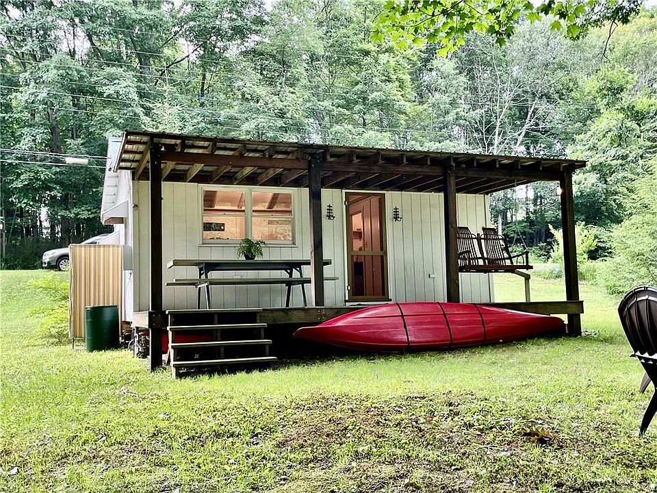 Amazing opportunity to own 100 feet of frontage on French Creek! Cottage is bright and open. Location and rear yard are fantastic! Rear porch is perfect for a swing and your morning coffee. Stairs lead to creek for easy access. Outdoor shower and half bath inside. No water well, but a holding tank and pump outside should suffice for most. Bedroom has a large storage closet. Large living room with high ceilings and a cute kitchen with mini fridge and sink. Bring your kayaks and some firewood!!