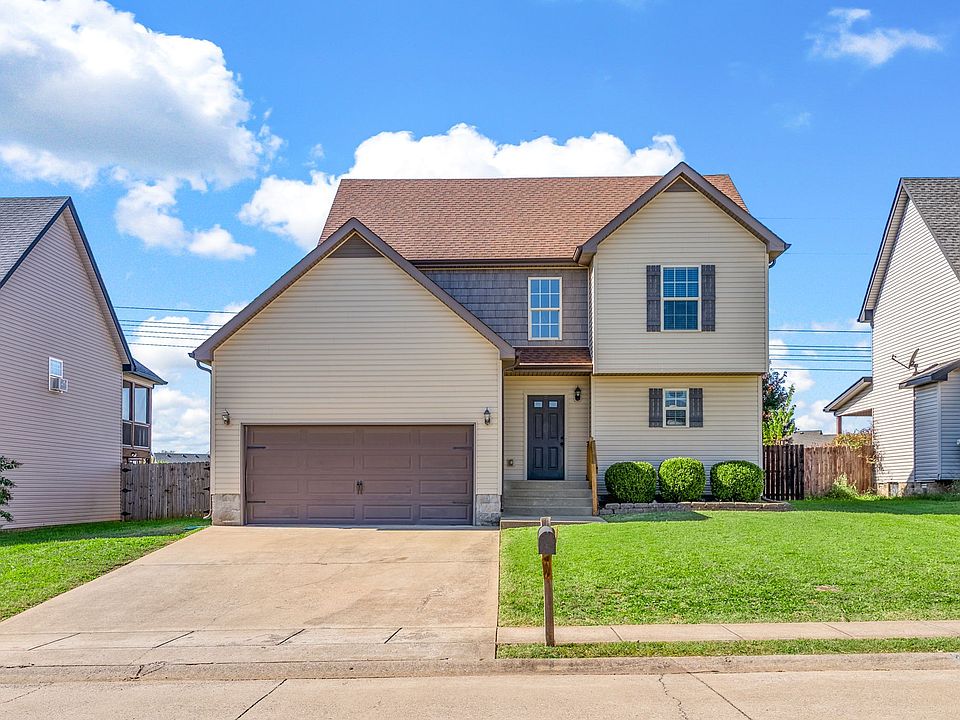 Welcome home to this beautiful two-story nestled on a spacious, level lot with a fully fenced backyard—ideal for play time, pets, and weekend barbecues. A welcoming foyer with tall ceilings and a convenient coat closet greets you as you enter, setting a cheerful tone for the rest of the home. The eat-in kitchen features stainless steel appliances, including a French-door refrigerator, a pantry for extra storage, and easy access to the garage—making grocery trips a breeze. The inviting living room is the perfect gathering space, offering plenty of natural light from two large windows and a cozy gas fireplace for relaxed evenings. The half bathroom is perfect for guests, rounding out the first level. Upstairs, you’ll find a generous primary suite complete with a full bath w/ a soaking tub—your own private retreat at the end of the day. Two additional spacious bedrooms, a second full bath, and a convenient upstairs laundry room complete the second floor. Located in a sought-after area close to schools, shopping, restaurants, and grocery stores, this home also offers an easy fifteen-minute commute to Ft. Campbell, KY. Sellers are willing to assist with some of the buyers closing expenses. Add this to your must see homes this weekend!