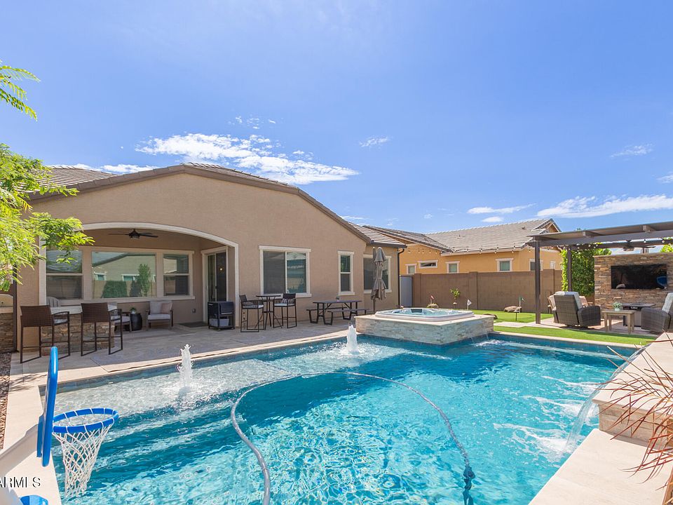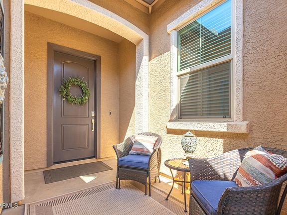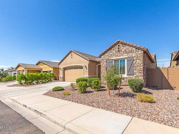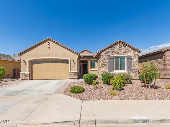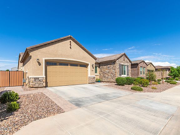 A rare find! This gorgeous single-level gem has everything you've been searching for. Inside, discover 10' ceilings, wood-look tile flooring, neutral paint, ceiling fans, and stylish light fixtures. The open floor plan is filled with natural light, creating an inviting space for both everyday living and entertaining. The well-appointed kitchen features granite counters, stainless steel appliances, ample cabinetry, tile backsplash, a pantry, and a prep island with breakfast bar. The serene primary retreat offers plush carpet, dual vanities, and two spacious walk-in closets. A 3-car garage and RV gate provide plenty of storage. Outdoors, enjoy a covered patio, gazebo, sparkling pool, and above-ground spa—perfect for Arizona living!