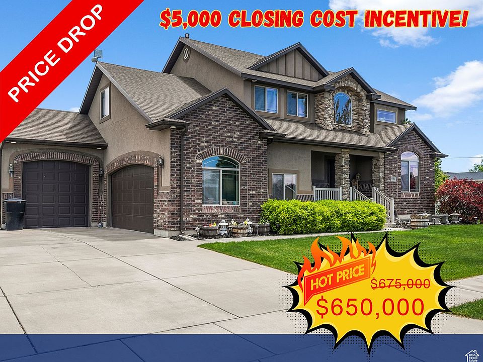 $25,000 Price Adjustment plus the seller is offering a $5,000 closing cost incentive. Welcome to this beautifully maintained home in Clinton, Utah, offering a spacious and fully fenced .34-acre yard complete with an included storage shed. The exterior showcases a timeless blend of stucco, brick, and stone, and a charming covered front porch while the oversized 4-car garage-with one extra-tall door-and additional RV parking provide all the space you need for vehicles and toys. Inside, the primary suite is a true retreat, featuring a generous sitting room, a walk-in closet, and a luxurious bathroom with an oversized jetted tub and separate shower. The main level boasts a formal living room and an open-concept great room with a cozy gas fireplace just off the kitchen, which is equipped with granite countertops, a 5-burner gas range, stainless steel appliances, staggered-height and depth cabinets, and tile floors. A sliding glass door leads to the backyard patio, which is wired for a hot tub and perfectly shaded in the evenings thanks to the home's desirable west-facing orientation. Additional conveniences include a mudroom/drop zone off the garage entry and an upstairs laundry room near the bedrooms. The lower level has been framed and is ready for your finishing touches. Located just half a mile from a large city park featuring volleyball courts, disc golf, a playground, sports fields, and pickle ball courts, and only 4.5 miles from Hill Air Force Base, this home also sits within 3.5 miles of three golf courses, offering an unbeatable combination of comfort, space, and location.