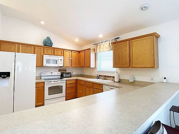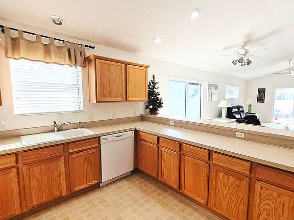 Step into a bright, open-concept living space where the kitchen flows seamlessly into the dining and living areas. The heart of the home features light wood cabinetry, recessed lighting, and a breakfast bar perfect for morning coffee or evening conversation. Large windows and sliding glass doors bathe the space in natural light, creating a cheerful atmosphere year-round.