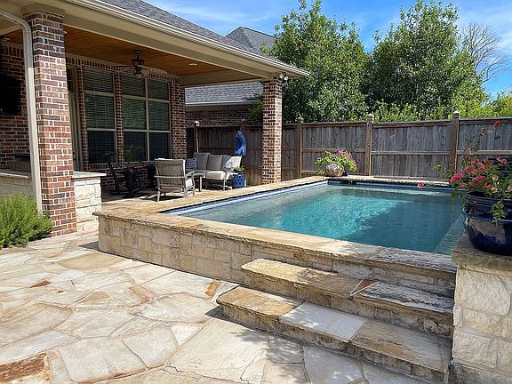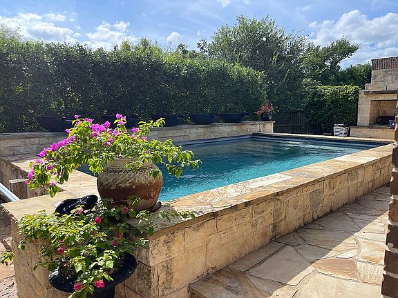 Outside, enjoy a resort-style backyard featuring a pool, outdoor fireplace, large stone patio, and a private, parklike setting—perfect for relaxing or hosting gatherings.