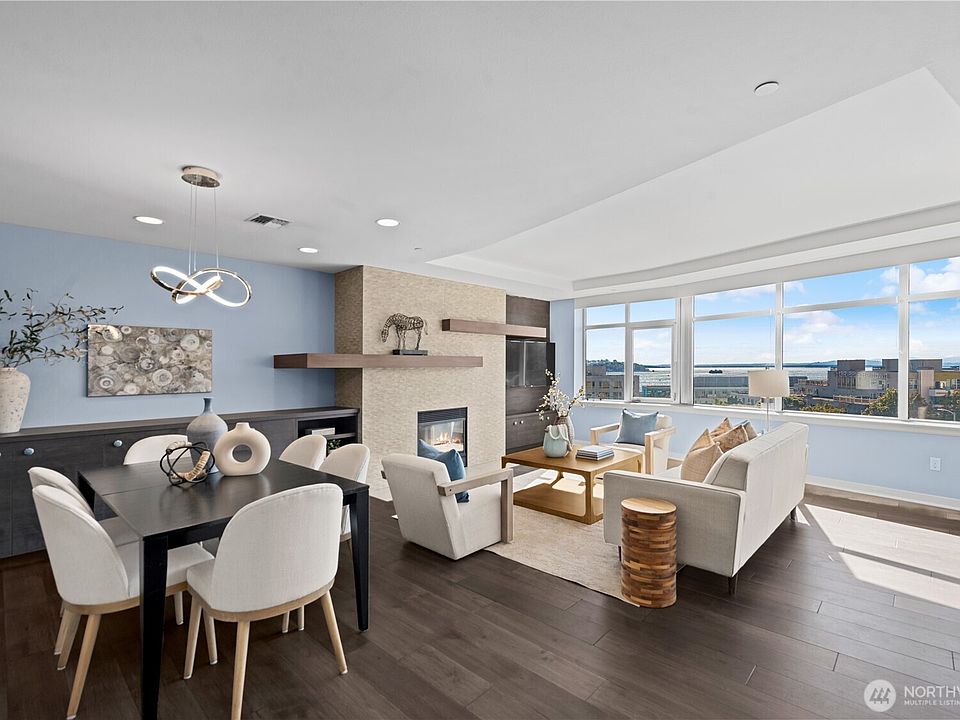The exceptional Pomeroy is a boutique building unlike anything else in Belltown with concrete and steel construction, perched over a designated city park, and offering views galore. This happily spacious home with almost 1600 square feet of luxury living has been recently updated with engineered hickory floors, built-in cabinetry, and a kitchen to please the cook. Elliot Bay and passing ferries can be seen through every window! The large primary suite will knock your socks off and has one of the few balconies in the building. This corner unit faces west, east AND north so the outlooks are ever engaging. Two full baths. Full sized laundry room. Separate home office. The Pomeroy also has the best rooftop deck around, just redone and glorious.