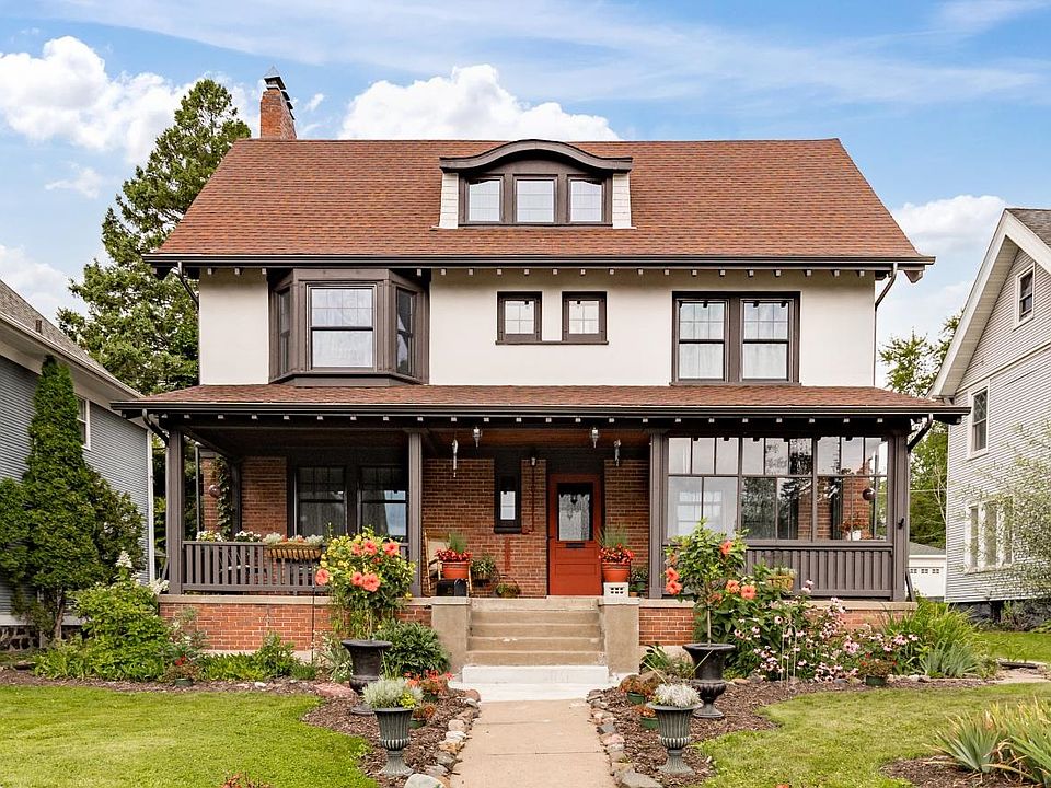Lovingly restored throughout, this Anton Werner Lignell–designed home originally built for the Moore family was thoughtfully renovated to be a forever home by the current owners. Though deeply cherished, life changes bring a new direction and an opportunity for you! This remarkable 5-bedroom, 3-bath home is a timeless blend of historic elegance & modern updates featuring refinished hardwood floors & meticulously refinished original woodwork that highlights its early 20th-century craftsmanship. The expansive front porch, framed by stately columns & original wood details, stretches across the home & offers a welcoming spot to enjoy quiet mornings or evening conversations with your delightful neighbors. Step into the foyer, rich in detail & character to start your taste for the rich history! The living room is warm and inviting, featuring a beautifully crafted gas fireplace that compliments the homes classic character while adding a modern touch. Restored leaded windows are both elegant & completely functional, welcoming in fresh air and natural light. In the formal dining room, original pocket doors lead to a stunning space with a coffered ceiling and rich wood accents! The kitchen features hickory cabinetry with clean lines & black granite countertops and sills that contrast beautifully with the lighter elements. Newer appliances make cooking a breeze, and a matching pantry seamlessly extends the kitchen in both function & design. A main-level half bath is convenient and tastefully finished. The grand staircase, a striking architectural centerpiece showcasing the craftsmanship of a bygone era, leads to the second floor with four spacious bedrooms and one including a gas fireplace, restored built-in cabinet, & a renovated full bath offering timeless appeal with updated finishes. A unique sunroom showcases original maple floors & windows perfect for relaxing. Upstairs, the third floor is an expansive, light-filled space with views of Lake Superior and newly added maple flooring that honors the home's era ideal for a studio, guest suite, or playroom. The lower level features laundry, a bathroom, sauna, excellent storage, & a versatile bonus area. Outside, enjoy a charming back porch and a private patio great for dining or relaxing. Both yards are newly landscaped to improve drainage and enhance curb appeal! Brand-new custom wood windows, updated plaster, stucco, & tuckpointing, this home is a beautifully renovated piece of history ready for its new chapter!