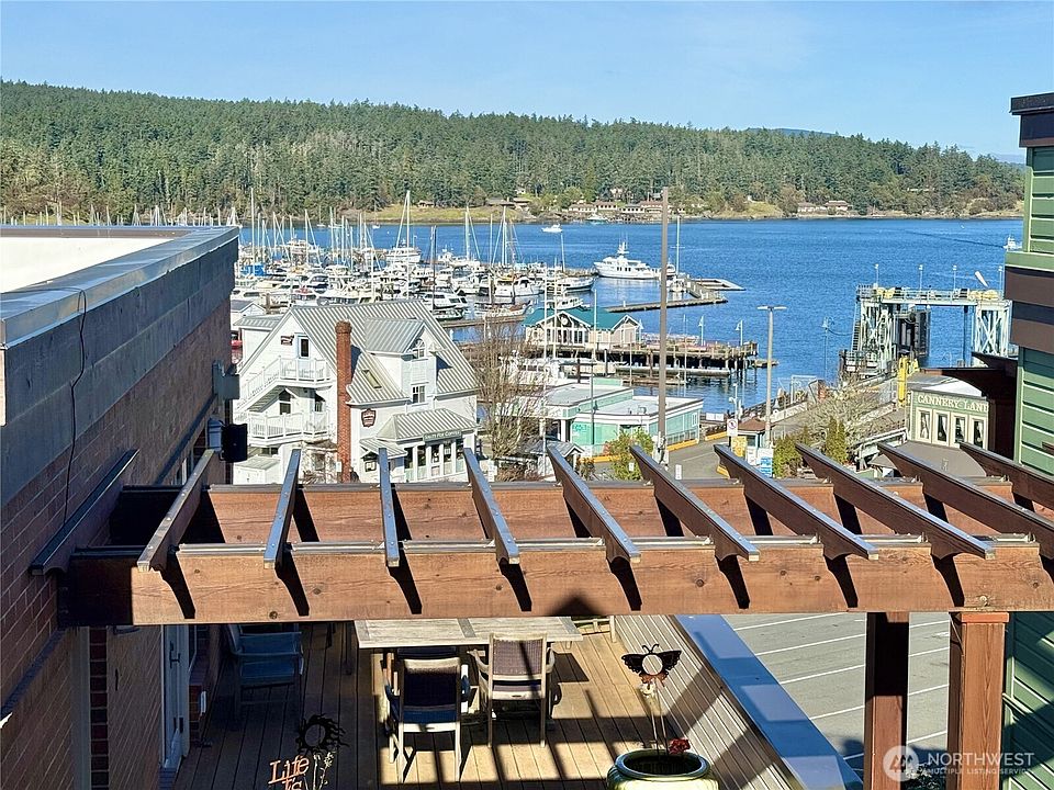 Live where the action is in the vibrant core of Friday Harbor! Just steps to the marina, ferry, restaurants, and shopping, this beautifully remodeled 1,628 sq ft condo offers the perfect blend of luxury, comfort, and convenience. Enjoy views of the harbor, ferry arrivals, seaplanes, and boating activity from the roof top deck. The open-concept living space features a dramatic floor-to-ceiling marble tile propane fireplace and abundant natural light. The chef’s kitchen is designed to impress with stainless steel Bosch appliances, induction range, generous eat-in island, quartz countertops, and marble backsplash. Two spacious bedrooms and two full baths include a stunning primary suite with vaulted ceilings, spa-inspired 5-piece bath with dual sinks and soaking tub, and a walk-in closet with custom built-ins. Mini-split heat & A/C ensure year-round comfort. Secure coded entry, elevator access, and dedicated parking for your island car in a secure garage provide convenience and peace of mind. Move-in ready and perfectly positioned in the heart of San Juan Island — enjoy effortless island living with harbor views. Nightly rentals allowed.