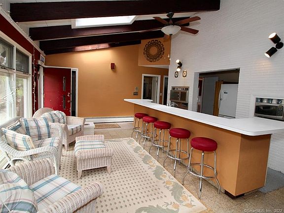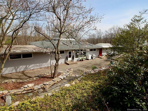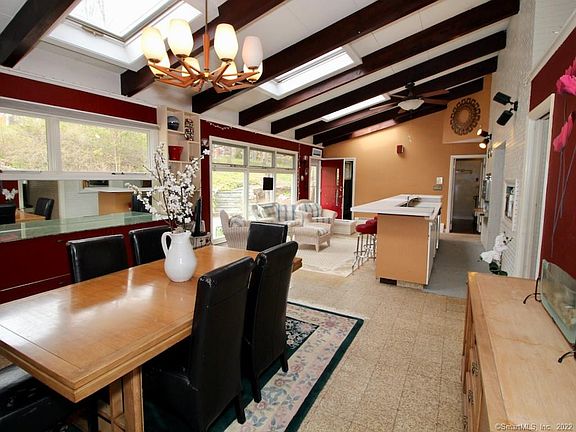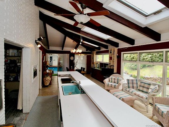 Unique opportunity to own this spacious Ranch in one of most desired areas of Meriden. Put on your HGTV hat for this 4 Bedroom, 3 Full Bath home with over 2,000 sq. ft. on main level. Located on 1.4 acres of privacy, the beautiful brick paver patio with stone walls welcome you Open floor plan at its best with vaulted ceilings, skylights, expansive kitchen and dining area. The kitchen area is huge, and affords many possibilities for designing your dream kitchen. Dining area can accommodate many. The living room, generous in size, features floor to ceiling brick wall with wood burning fireplace. Upon entering the home, there is a dedicated office with main level laundry for convenience. Windows galore. The Primary Bedroom boasts an updated Full Bath, with modern style double sinks, and glass shower enclosure. Two additional bedrooms are found on the main level, with the 4th Bedroom located downstairs. The lower level at approx. 1,760 sq. ft. hosts a great room, with fireplace and full bath. Storage rooms & work shop areas are also located downstairs as this house won't find you lacking in storage space. Two car garage. Mechanicals updated approx. 7 years ago. Four zone heat. Glass slider leads to deck in the back of the house. New Septic installed Nov. 2021. New roof over main house done approx. 3 years ago. Off to the side of the home, glass sliders lead to the Indoor pool/sunroom. Possibilities are endless - Make an Offer Come make this home your own Property sold As Is.