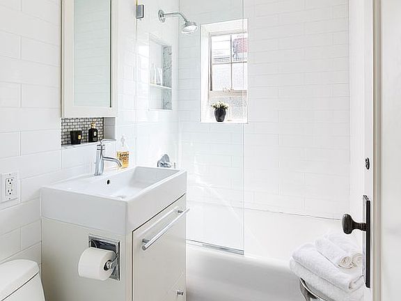 The tranquil king-sized bedroom boasts two south-facing windows and two double closets. Down the hall is a tranquil windowed bathroom with a porcelain tub, marble flooring, and subway tiling.
