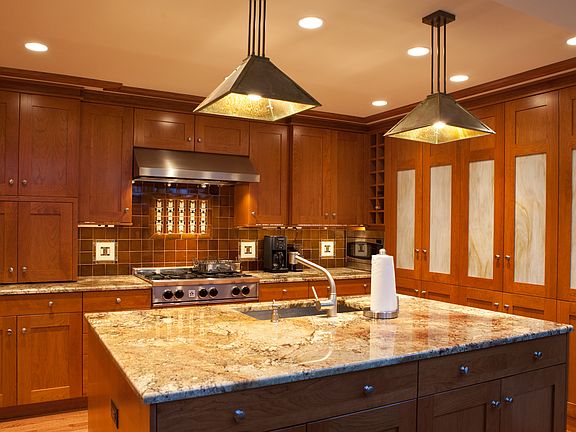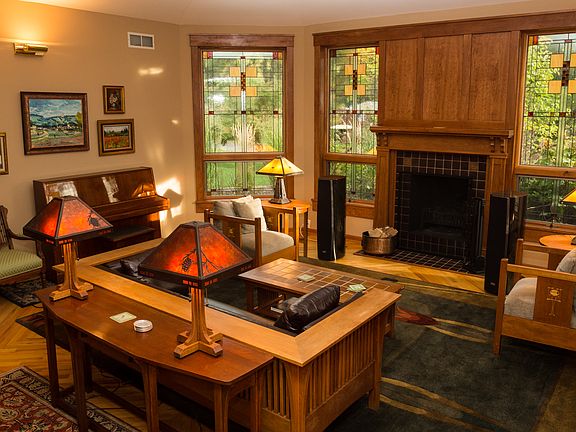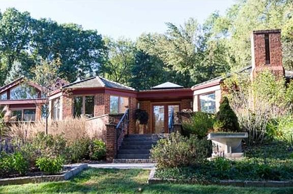 Frank Lloyd Wright inspired"Prairie style" w/ custom designed beveled glass front door, art glass windows & panels thruout. Open fl plan flows w/ cherry moldings & trim linking Liv,Din & Kitchen together. Gourmet kitchen w/ custom cherry cabs, beautiful granite, high end appl & Butler's Pantry. Light filled Fam rm overlooks private patio, flat yard and woods. Master Suite w/ vaulted ceiling opens to front veranda. Gorgeous master bath. Patio w/ grill station and custom pergola. Beautiful & Very Special.