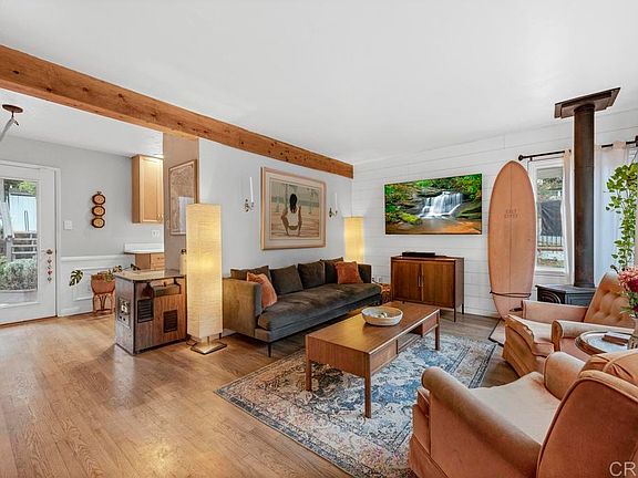 Charming and Bright! This cute cottage is in the heart of Vista, close to downtown. Upgraded 2 bedrooms, 1 bath, original hardwood floors throughout, dual pane windows, a newer kitchen with Corian countertops, maple cabinets and newer appliances. The home features an updated bathroom, a Vermont Casting wood-burning stove in living room, newer roof, newer plumbing and sewer line, new water heater, and a 200 amp electrical panel with an outlet on the side of the home for a generator or electric vehicle. Zoned R2, the entire .21 acre property is fenced front and back with an electric driveway gate set (steel/wood). The two level backyard has been landscaped with 2 brick patios, a firepit, raised garden beds and decomposed granite. Easily park 3-4 cars in the driveway and close the gate. This home feels like a secluded oasis, close to downtown.
