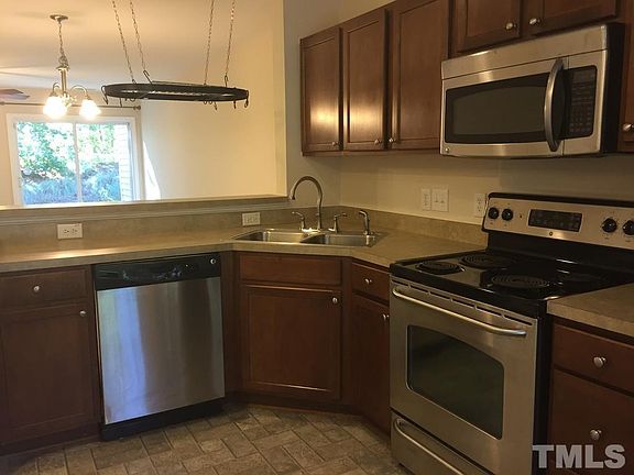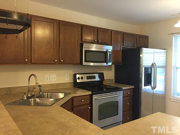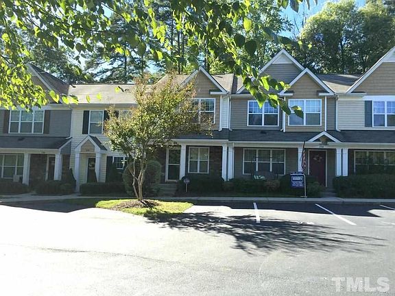 Conveniently located, minutes from downtown Apex. This town home which is filled with natural light is move in ready! Covered front porch and located in a cul-de-sac. New carpet in rooms, large clean kitchen (with refrigerator) open to the dining and living area. On the second floor there are 2 bedrooms both with en-suite bathrooms. Washer and dryer included. The small backyard backs onto the woods. The home is located within 4 miles of the 540 interchange and less than a mile from 55.