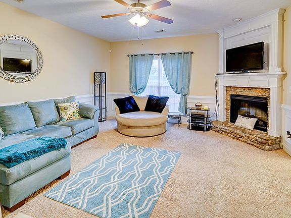 This two story house is in immaculate condition. The front yard nicely landscaped with a flower bed. The front and back yard has automatic sprinklers. The 2 car garage has surrounding stone accent. Walk in the home into the foyer that has hardwood vinyl. There is a half bathroom that is off of the foyer. There is a full bathroom upstairs for guests. The great room features a electric fireplace that has stone surrounding and wood hearth. The kitchen has stainless steel appliances, pantry, tile back splash around cook tops, and granite counter tops. All bedrooms upstairs and the great room have carpet. The laundry room is located upstairs for privacy. The master bedroom has tray ceilings with decorative trim. The master bath features dual vanity sinks, over sized soaker tub with tile surround back splash, separate stand up shower. The master bedroom has a walk in closet. The spare bedrooms both have walk in closets. The backyard is completely landscaped and has a shadowbox privacy fence. There is also has a rear patio (10x15) that would be great for grilling. The attic has been boarded to increase storage space. Great to store military gear or those items needed only once a year. The smaller spare bedroom has attic storage space on both sides of the room with separate doors.