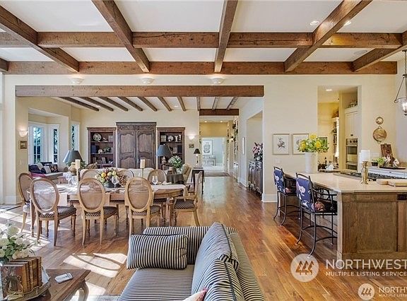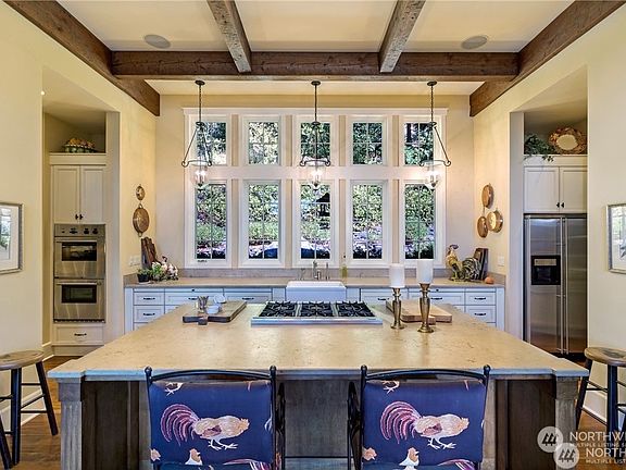 Gorgeous end of the road fenced and gated setting on 2+ south facing acres and 500' of waterfront on Harney Channel. One level main home features open floor plan with French doors flowing to large water side patios. Custom open chef's kitchen with two separate behind the scenes prep areas, large bar seating area is open to the great room. Above the two car detached garage is a comfortable guest space/studio. Delightful private cove beach, mooring buoy and access to the amenities of the community dock and sandy beach. Just minutes to the ferry and amenities of the Orcas Village.