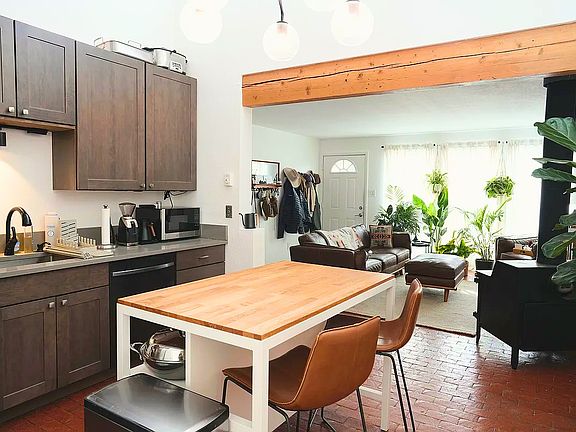 Cozy wood-burning stoveTree-shaded streetContemporary countertopsPassive solar layoutRecent upgradesSleek cabinetryRich brick flooring