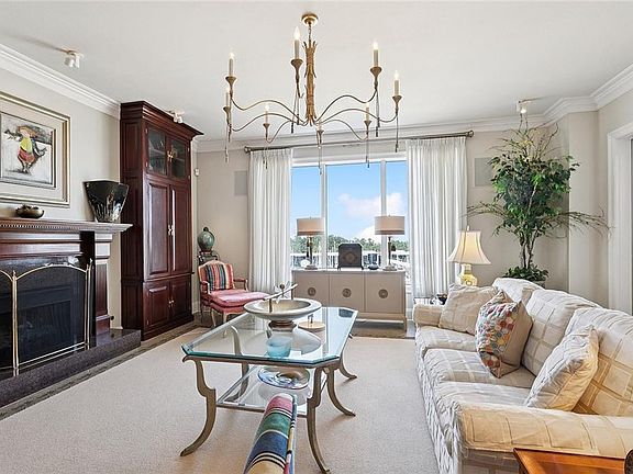The elegant primary suite includes a bonus sitting area, an oversized custom closet, and a spa-like bath with dual vanities, a soaking tub, and a walk-in steam shower. The gourmet kitchen opens to the den, providing seamless flow and marina views, while a formal dining area sets the stage for memorable gatherings. A second bedroom with a private ensuite bath offers comfort for guests or family.