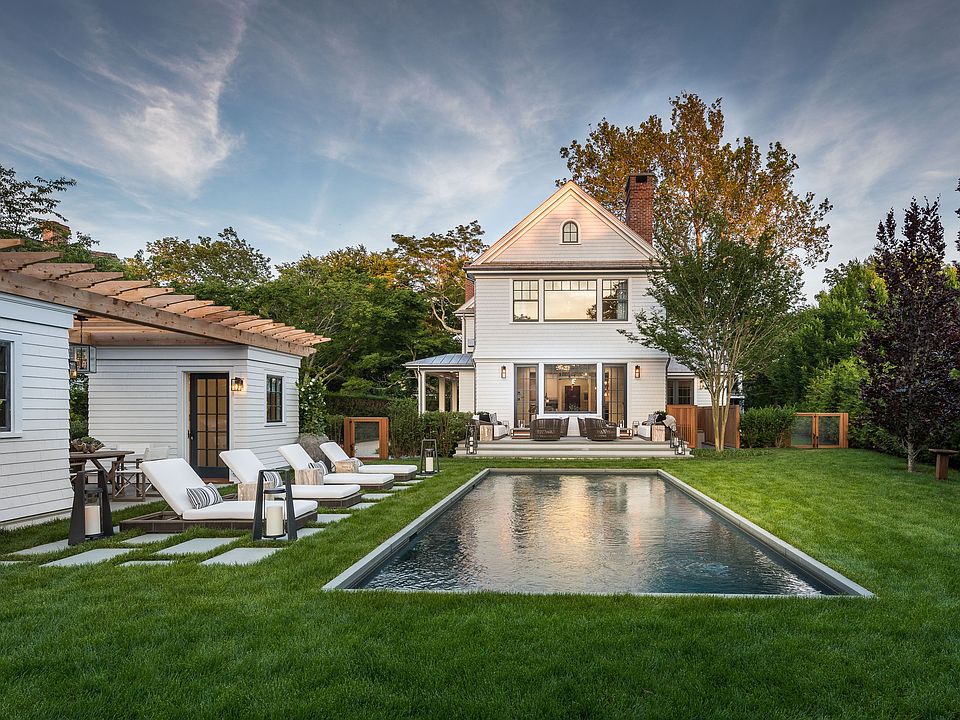 Custom-built with , 232 Main Street embodies modern Hamptons living at its finest. Located in the heart of Sag Harbor's storied Captain's Row, this exceptional residence combines architecture by Val Florio, interiors by Alicia Murphy, and landscaping by Christopher LaGuardia and Marders-a true collaboration of premier local talent.Spanning 4,800A± SF across three levels, the home offers 5 bedrooms, 6 full and 2 half baths, and an effortless indoor-outdoor flow. The first floor's open plan features a gourmet kitchen with Quartzite countertops and La Cornue range, a spacious great room with Danby marble fireplace, dining area, and a richly detailed walnut-paneled library. A first-floor guest suite opens through French doors to one of two stone patios. Upstairs, two ensuite guest bedrooms complement a luxurious primary suite overlooking the grounds, complete with a spa bath and full laundry. The lower level enjoys full-height windows and natural light, with space for a media lounge, game area, and entertaining bar. Outside, enjoy a heated pool, pool house with kitchenette, and outdoor shower, all surrounded by lush professional landscaping. With a one-car garage and village life just steps away, you can leave the car behind and stroll to the harbor, shops, and restaurants.
