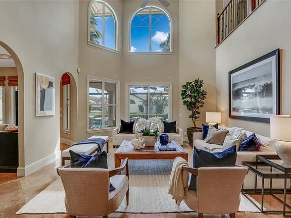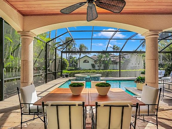 V.79 - Beautiful! View Video. Beyond the stately secured Gatehouse that leads to the exclusive Beach enclave of Bay Colony is the enchanting Villa neighborhood of Vizcaya. This two-story fabulously updated home is sited on a cul-de-sac street showcasing a charming inviting Gazebo. Defining today's indoor-outdoor living is an expansive covered lanai complemented by a picture-window caged pool, spa & deck on a tranquil lakefront setting. A cleverly designed center island punctuates the gorgeous open living space for easy entertaining and seamless flow. Access the outdoors from your relaxing ground-floor Owner's Suite while your guests select from four spacious upstairs bedrooms where they can also sunbathe on a private balcony. Enjoy a luxury lifestyle with private beach access and attended service, a tennis center and a fabulously remodeled member-only Beach Club and restaurant all set within SWFL's most desired beachfront community, Pelican Bay. Bordered by the Waterside Shops & Artis-Naples to the south and the Ritz Carlton to the north, it has two additional private beach restaurants, over two miles of coastline and epitomizes elegant casual living.