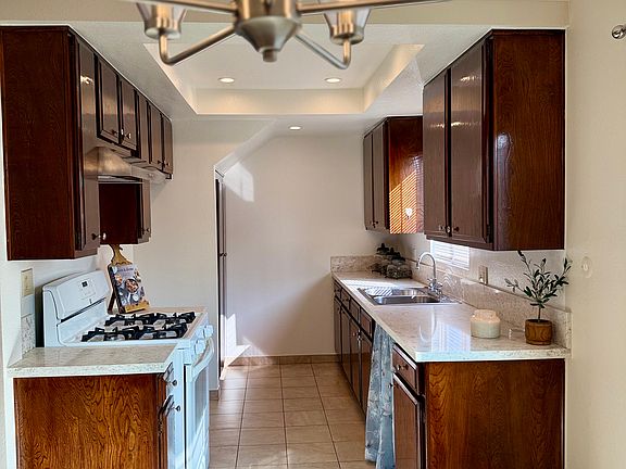 kitchen with stove, granite countertops, and pantry. Dining room with chandelier,