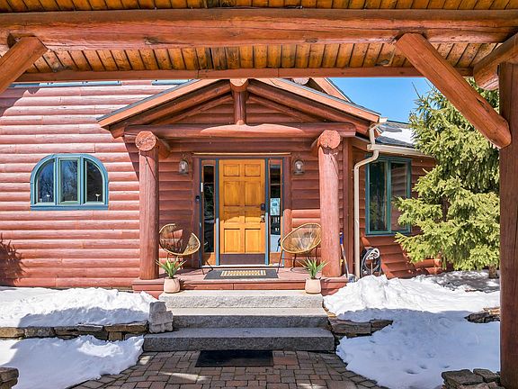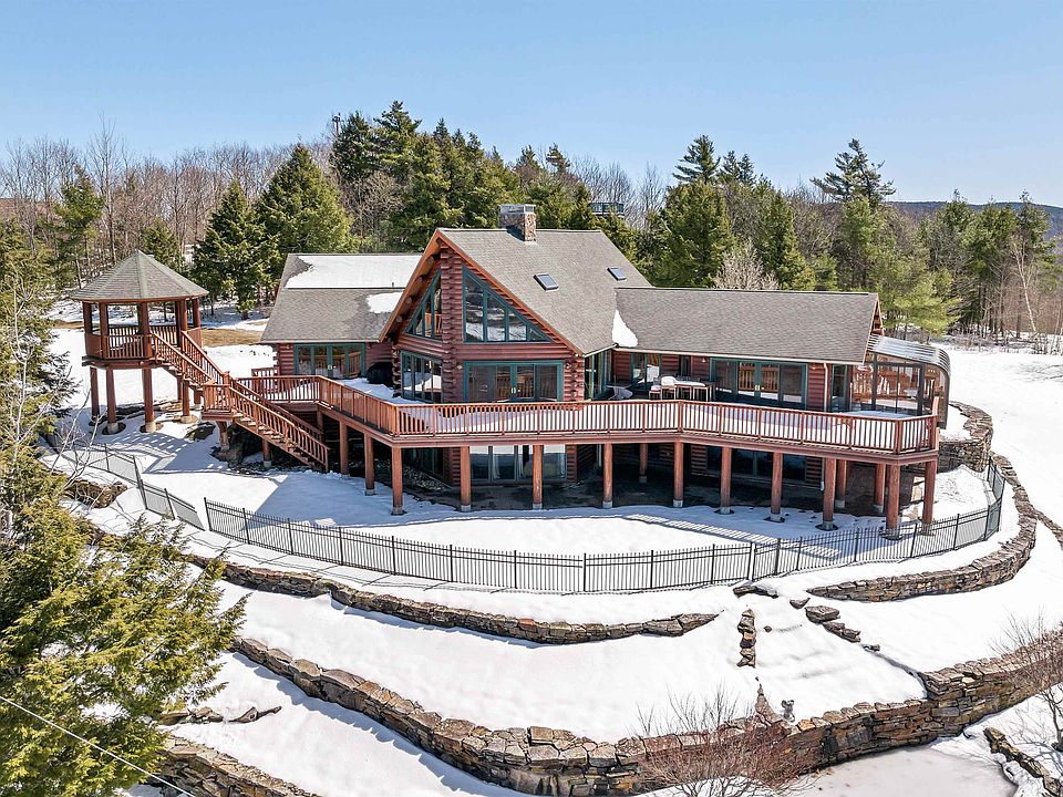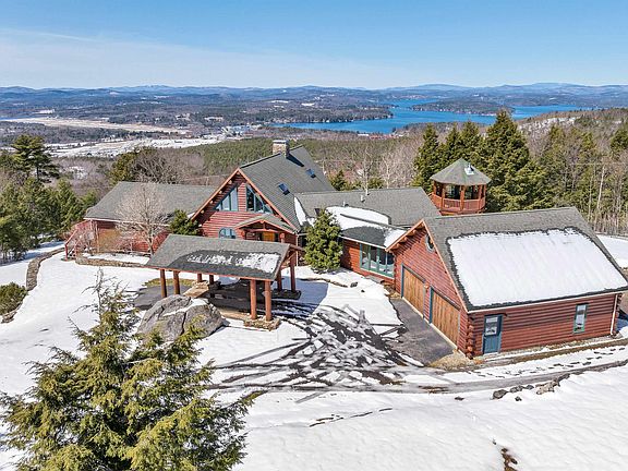 Perched atop a scenic vantage in Gilford, this log sanctuary is the quintessence of luxury intertwined with the tranquil charm of a woodland retreat, showcasing breathtaking vistas of Lake Winnipesaukee and the peaks of Gunstock Mountain Resort. Every detail radiates craftsmanship, offering a living experience that is intimately connected to nature. This residence beckons with an open-concept interior where towering windows invite the splendor of the outside world. A chef's delight, the gourmet kitchen, featuring a vast island and high-end appliances, flows into an inviting living space with a stunning double-sided stone fireplace. The master suite extends into a luminous conservatory, leading to a grand wraparound deck crowned with a gazebo, the stage for serene sunset soirées. Additional luxuries include a versatile loft, and an expansive lower level with its own kitchen and separate entrance. Enjoy a beautifully landscaped double lot, a circular drive framed by an elegant fountain, terraced stone walls, and an inviting fire pit. A practical mudroom and breezeway guide you to the three-car garage, boasting a versatile finished room above, perfect as an additional bedroom, home office, or artist’s studio. Located merely minutes from the ski resort, private lake access, and the vibrant heart of Gilford with its town beach, shopping, and entertainment, this property offers room to grow and flourish. Enjoy the Lakes Region like never before!