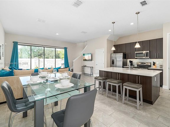 Luxurious two-story home in the gated Villa Domani resort, fully furnished and ideal for a first home. This 4-bedroom property is located minutes from Champions Gate’s shopping, dining, and only 15 minutes from Disney. The main level includes a modern kitchen with 42” wood cabinets, quartz countertops, and stainless appliances. Sliding doors open to a private courtyard with a fenced lanai and splash pool. Upstairs offers spacious bedrooms, a loft, and a voluminous master with a large walk in glass shower. Villa Domani amenities include a clubhouse, fitness center, pool, and spa.