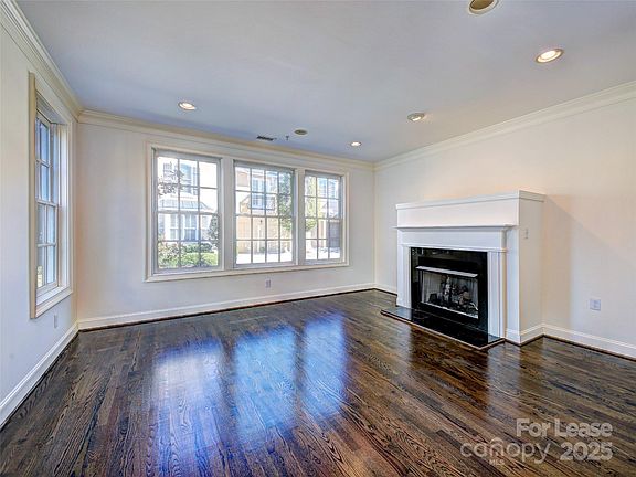 Elegant and light-filled townhome in a private gated community, just minutes from Uptown! The inviting living room with fireplace flows seamlessly into the dining area. The kitchen opens to a sunny breakfast area and den with built-ins and a second fireplace. There is a deck off the den perfect for grilling and a small fenced green area too. The spacious primary retreat offers a sitting area, third fireplace, and large walk-in closet. Upstairs also features two additional bedrooms with a shared bath. The laundry is also conveniently located on the upper level. Generous 2 car garage with storage cabinets and shelving. Additional highlights include high ceilings, plantation shutters, blinds, dark hardwood floors on the main level and carpeting on the upper level. Refrigerator, washer, and dryer included. Enjoy a lock-and-leave lifestyle with the greenway, dining and shopping just around the corner.