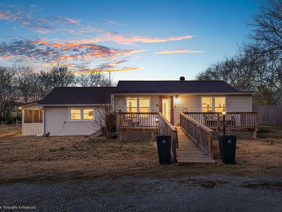 Your dream farmhouse awaits less than 30 minutes from BNA! This spacious 2 bedroom home is perfectly positioned on an almost 4 acre level lot with private gated entry. Enjoy the springtime on this picturesque property surrounded by fruit trees, beautiful field space, a livestock watering pool, with a pond for your ducks, and coop for your chickens. The large kitchen is ideal for entertaining or daily living with an abundance of prep space. There is a gas fireplace in both living spaces. The sunlit area in the entry is ideal for a sunroom, study, or dining area. The primary suite is large and secluded ensuring privacy. The screened in patio is perfect for relaxing all year round.