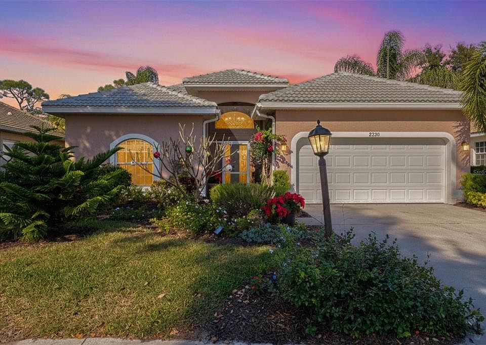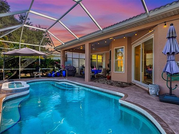 Welcome Home to Falcon Trace at Calusa Lakes. This beautifully maintained 3 bedroom 2 bathroom pool home offers nearly 2,000 square feet of living space along with a 2 car garage and lush landscaping that creates inviting curb appeal from the moment you arrive. Sidewalks wind through the neighborhood and the tile roof and mature greenery frame the entrance perfectly. Double front doors open into a welcoming foyer where luxury vinyl plank flooring flows throughout and plantation shutters elevate every room. French doors lead to the third bedroom which is currently used as a den and makes an ideal guest space or home office. The open concept layout showcases soaring ceilings and a spacious living area that flows effortlessly into the beautifully renovated kitchen. Here you will find granite countertops, a massive island that seats six to eight people, two tone cabinetry, stainless steel appliances, and a stylish backsplash that ties the space together. The owner’s suite features crown molding, sliding glass doors that open to the lanai, and a private ensuite bathroom with dual sinks, a large soaking tub, and a walk in shower. The guest bedrooms are ideally situated near the updated guest bathroom which features a granite topped vanity. Enjoy the convenience of an indoor laundry room. Step outside to the backyard oasis which is an entertainer’s dream with a large heated saltwater pool perfect for year round enjoyment. Additional updates include a newer pool pump and aerator, water softener, HURRICANE IMPACT WINDOWS, and more for peace of mind. Falcon Trace offers maintenance free living which includes lawn and landscape shrub cutting. Residents enjoy amenities such as pickleball, tennis, a heated community pool, social activities, and access to a beautiful semi private eighteen hole golf course with an optional golf membership along with a restaurant and pro shop. Calusa Lakes is located between Venice and Sarasota minutes from I 75, shopping, dining, and historic downtown Venice. Outdoor enthusiasts will love the nearby Legacy Bike Trail along with Nokomis Beach and the stunning beaches of Venice and Caspersen just a short drive away. This hidden gem is also located near the newer Sarasota Memorial Hospital. Schedule your showing today.