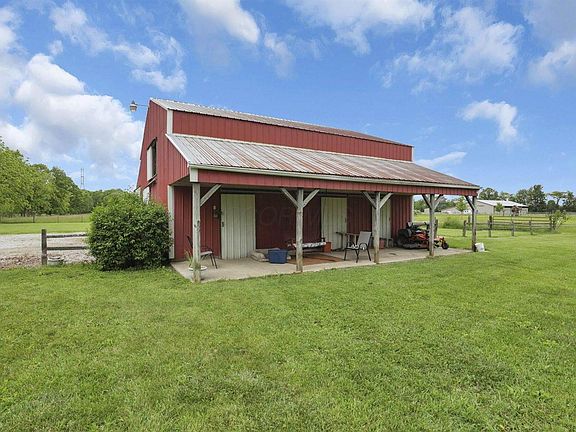 A MINI FARM GEM! 20 Minutes from Polaris Fashion Mall, 25 Minutes to Port Columbus Airport. Complete with fully equipped shop/ barn located in a fantastic, animal- and toy- lover-friendly neighborhood, This charming brick ranch home offers a basement with new windows and a lifetime guarantee for no water problems and new bracing installed last year. The Roof is five years old. The furnace and 24 hot water tank new 2025. The barn, and the garage can hold 10 automobiles inside on concrete. The concrete pad on the west side of the barn is wired for a 220 hot tub. The back concrete pad as power, sand and is leveled for an above ground pool. The water softener system is three years old. The well pump is four years old and well and lines updated. The barn has a 220 air compressor in the upstairs hayloft for quiet while working in the shop with four airdrops throughout the shop so air is always close to you when you're doing your projects, the upstairs Hayloft can be completely shut off for easy, heating the downstairs insulate temperature controlled shop area of the barn. . Plenty of parking for large get-togethers at the barn with easy access for trailer turnaround 5 acre pasture field is great for ponies, horses or whatever your if you just want to raise your own beef cows, Yard shed can be used for garden tools or a chicken coop Dirt pile backstop if you enjoy target shooting. Private property with no residential housing directly behind. Mature apple and pear trees. Listing agent is related to the seller.