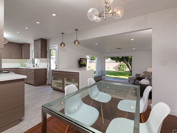 Stylish mid-century home with modern remodel. Living room features hardwood flooring, fireplace, and large picture window with natural light. Remodeled Kitchen has beautiful clean front wood cabinets, quartz counters, subway backsplash, recessed lighting, tile flooring, quartz breakfast bar, and ample storage. Dining area is open to kitchen, living, and den with designer light fixture. Large den off kitchen has custom 8 foot frameless metal French doors that transition you to the beautiful backyard. Powder room is remodeled with wall mount sink, marble floor, and features a designer wall panel. Main bath features a double sink vanity with oversized wall mirror, flat panel cabinetry with quartz counter, tiled bath/ shower surround with enclave, and penny tile floor. Plenty of storage throughout and Central AC. One car garage is set back with a gated long driveway for parking and recreation. Additional porcelin tiled 3/4 bathroom with oversize walk-in curbless shower and laundry room added to garage. 128 sqft detached art studio/office behind garage. Huge lot features large grass area, patio, and mature fruit trees. All of this in highly sought after Los Altos neighborhood with award winning schools.