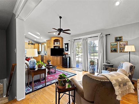 Experience the perfect blend of country charm and modern comfort on this 15+ acre estate, ideally located just off blacktop east of 291 Hwy South. The beautifully updated ranch-style home features light-filled living spaces, vaulted ceilings, and a cozy brick fireplace that creates a warm and inviting atmosphere. The open kitchen showcases granite countertops, natural wood cabinetry, stainless steel appliances, and a breakfast island with views of the scenic acreage beyond.