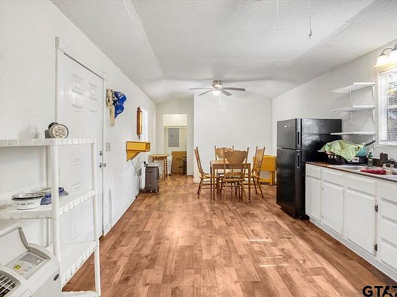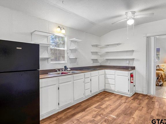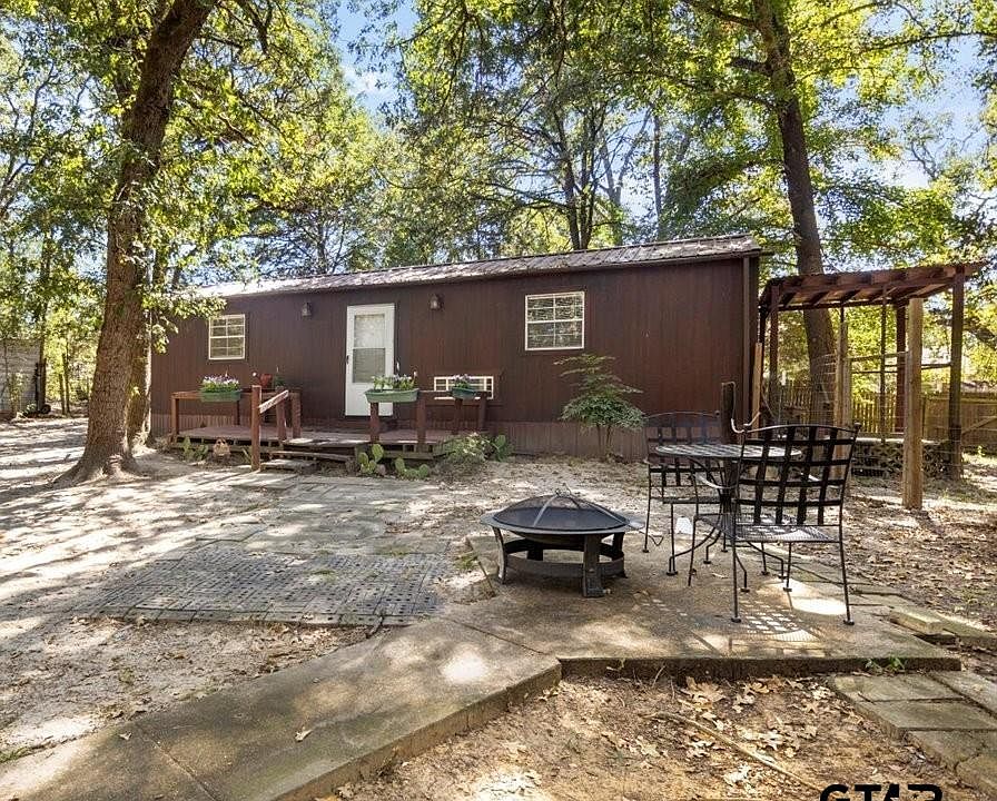 Charming rustic cottage with 1 bedroom, 1 bath. Nestled among the trees with fully fenced .40 acres and gate for privacy. Home has full kitchen with electric cooktop, wood cabinets, refrigerator, open shelving and plenty countertop space. Outside, there are 2 porches to enjoy, 3 storage sheds - including a laundry shed that has a window unit, wood burning fireplace and room for man cave/she shed, storm shelter, firepit area with seating and property is cross fenced. LOW utility bills!