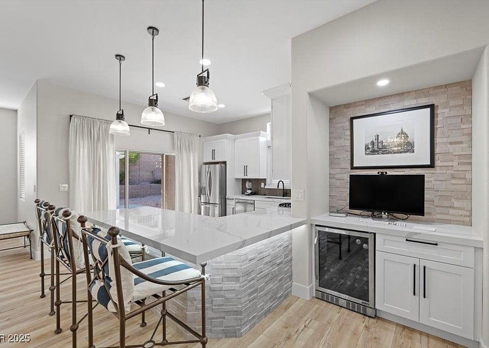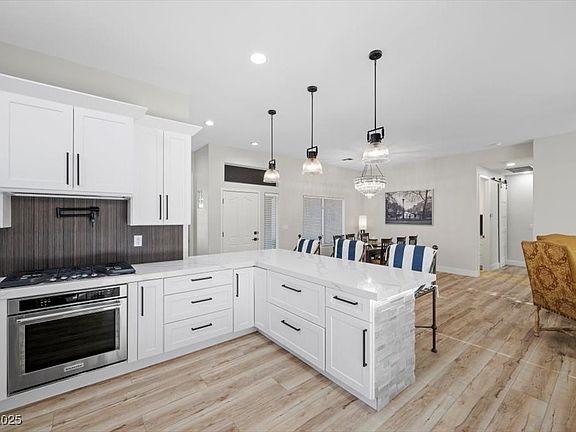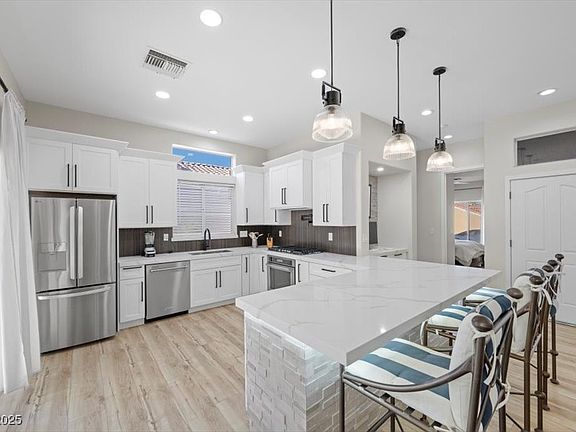 The open floor plan features expanded kitchen, increased counter space, tiled backsplash 42"cabinets, quartz countertop and beverage center with custom stonework. New KitchenAid appliance package, with cooktop, oven, dishwasher and LG refrigerator.
