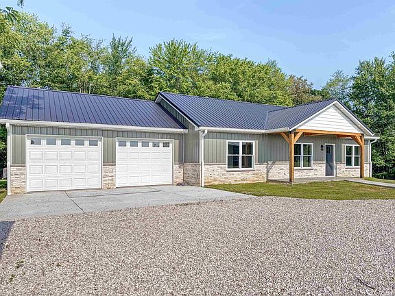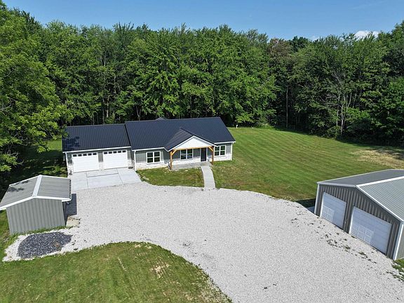 Brand new Craftsman style ranch home on 1.8 acres in a private and picturesque country setting. Many upgrades and conveniences are featured throughout this carefully planned home such as 2x6 exterior walls, full spray foam insulation, and a minimum of 9' ceilings. The open floor plan of the main living area offers a beautiful vaulted ceiling and seamless flow from the generously sized living area into the kitchen, which features a center island crafted from hickory with a recessed electrical outlet for convenience and safety. Details in the kitchen matter such as custom Amish built cabinetry with soft close, gorgeous quartz countertops, tiled backsplash, a cute coffee bar, and all brand new LG appliances. Primary bedroom offers a lovely ensuite bathroom with double bowl vanity, step in tiled shower, and walk-in closet. On the opposite side of the home are 2 others bedrooms which share a hall bathroom. Right off the kitchen is the laundry area, complete with W/D and utility sink, which leads to the climate controlled 2 car attached garage with water service, linear drain, LED lighting, and attic storage. Step outside to relax on the back covered patio featuring solid cedar posts, vaulted ceiling, and stamped concrete. If you need a workshop or more garage spaces, there's a 24'x32' pole building with separate 200 amp service and another 12'x16' storage shed.