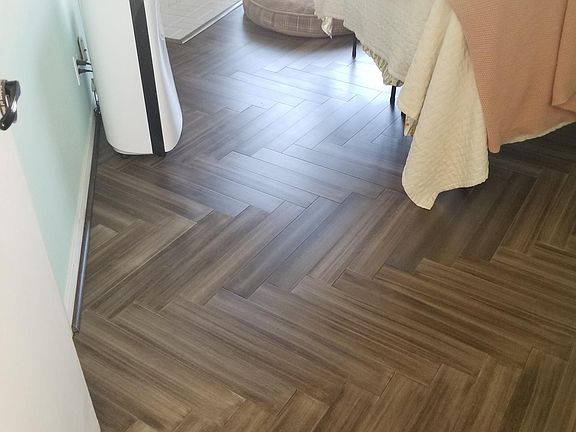 Tropical fanGranite countersBamboo floorNew metal staircaseWood look white tilePebbles style flooring