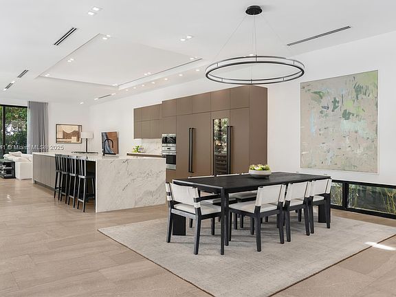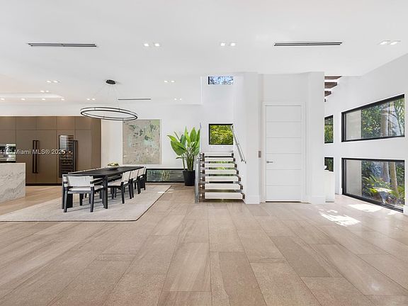 Behind a private gated entry, this tropical modern residence in North Coconut Grove blends striking design with serene surroundings. Set on a quiet, tree-canopied street near bayfront parks and marinas, the home features soaring ceilings, stone and wood floors, custom built-ins, and a chef’s kitchen with Italian cabinetry and SubZero/Wolf appliances. The primary suite offers a spa-like bath with soaking tub and glass rain shower. A floating staircase, elevator, impact glass, and 48kw generator enhance comfort and security. Outdoor living shines with a lush pool, covered terrace, and rooftop deck showcasing panoramic Grove views.