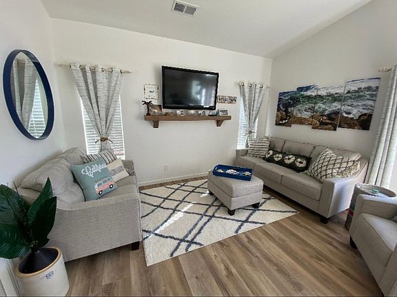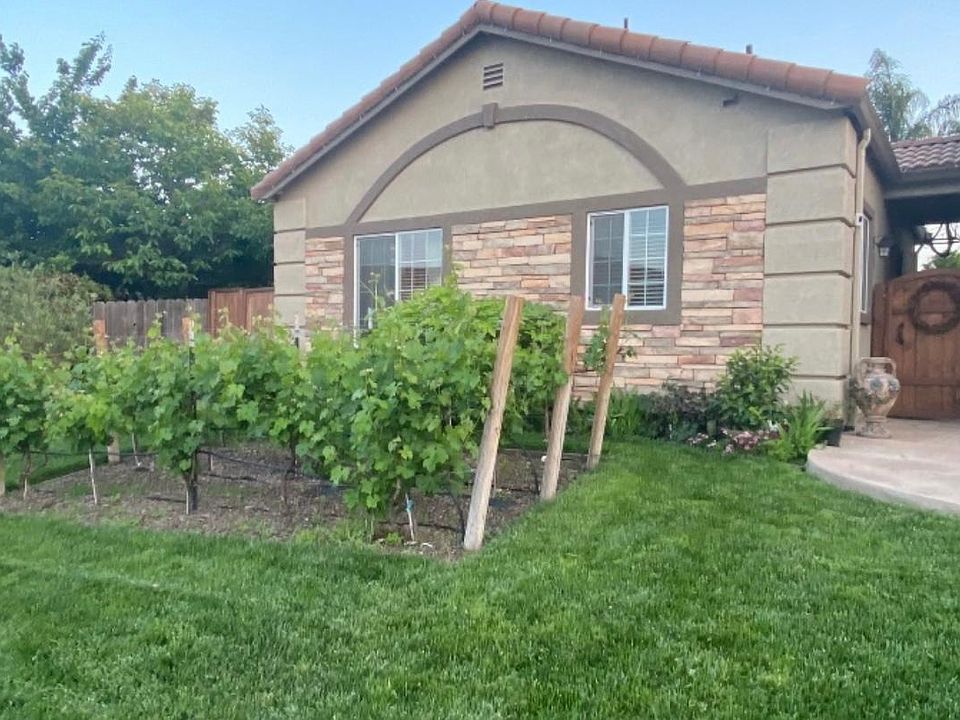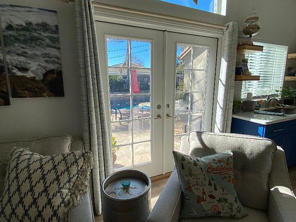 Very spacious, beautiful California themed cottage with private entry from the main home. It’s fully furnished with all the amenities you need for an extended stay. It has an open kitchen & family room with a vaulted ceiling. Kitchen has a full sized refrigerator & table that seats 4. There is also a full sized sleeper sofa pull out bed & a 65” flat screen tv. There are French doors that open up to the pool area with lounge chairs & hanging string lights. Large master bedroom has frosted glass doors that slide into the wall to provide even more room & ambiance. The master bedroom window looks over our small vineyard, where we grow Cabernet Sauvignon grapes in the front of the house. It also features a comfortable Tempur-Pedic adjustable bed. The bathroom is very spacious with a large walk-in closet, a large washer/dryer combo & a beautiful large walk-in shower. There is a comfortable sitting area in the front overlooking the vineyard. There is also a lounging area out back by the pool, with a gas grill.