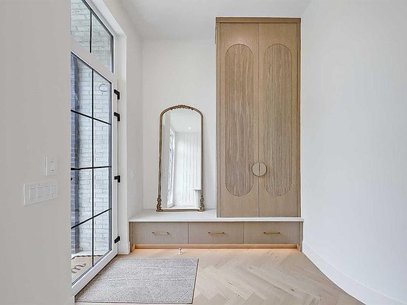 Quiet streetWide-plank herringbone engineered hardwoodFull-height glass doorCustom mitered detailsCoat closetLower drawersFront dining room
