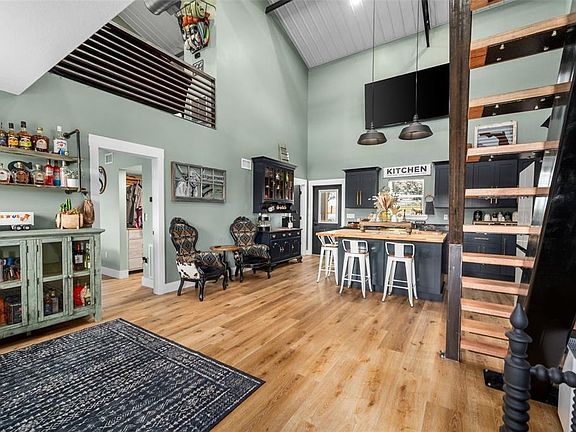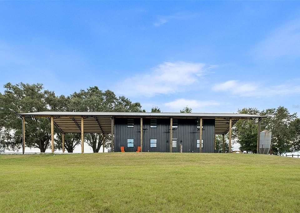 Welcome to your private farm retreat in Morriston, Florida. This custom, newly built 3-bedroom, 2-bath home is set on 19.34 acres of fully fenced pastureland and offers a rare blend of functionality, style, and peaceful rural living. With approximately 3,840 square feet under roof, the residence includes expansive covered outdoor living space—perfect for relaxing, entertaining, or enjoying the quiet beauty of the countryside. Designed with a modern industrial aesthetic, the interior features vaulted ceilings with exposed steel trusses, an open-concept layout, and carefully chosen finishes that blend warmth with bold architectural detail. The kitchen is outfitted with black cabinetry, gold hardware, a butcher block island, and a farmhouse sink. A custom staircase with steel railings leads to a versatile loft space that can also be accessed by a separate outdoor staircase, offering flexible use as a guest area, office, or bonus room. The main living areas feature wood-style flooring and large windows for natural light. Bathrooms are thoughtfully designed with tiled walk-in showers and modern fixtures, and the laundry area includes herringbone brick flooring and built-in storage. A separate 40x60 pole barn with a 20x60 lean-to provides ample space for equipment, trailers, or future stalls. The acreage includes open, cross-fenced pastures and a private pond stocked with fish. Nine cows and one goat may be included in the sale, making this a truly turnkey farm. Located just minutes from Williston and a short drive to Ocala, the World Equestrian Center, and popular trailheads, this unique property is ideal for anyone looking for a self-sufficient lifestyle with modern comfort and rural charm—no HOA and agriculture zoning in place.