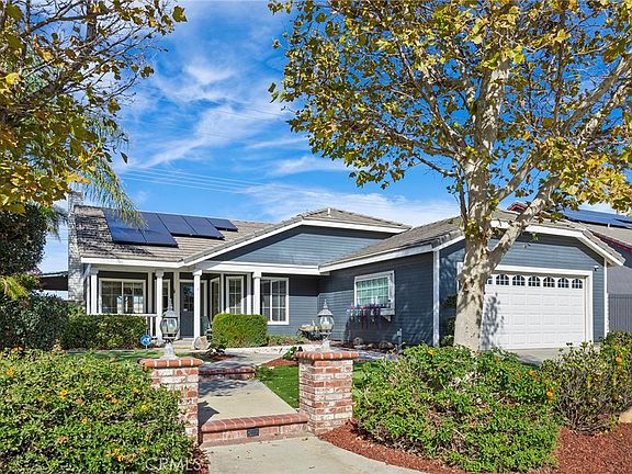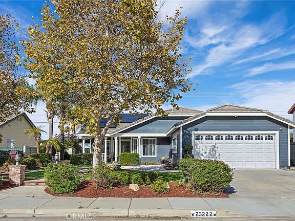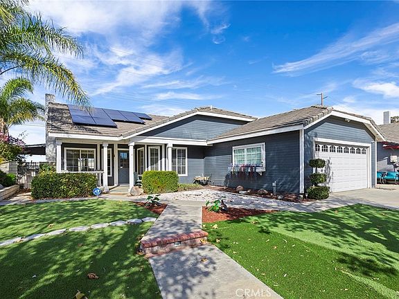 A well kept 3 bedroom and 2 bath single story home with 2 car garage and an extended driveway enough to park your toys, in addition to a RV parking complete with electrical outlets. The front features a beautiful entry way with mature trees that provides ample shade and curve appeal. This home has a new HVAC and air duct system that is only about 2 years old and a solar system that covers your monthly electric usage. The home is secured by a whole house ADT alarm system. New laminate flooring leading to the bedrooms. Going to the backyard from the living room is a French doorway that takes you to your private covered patio with built in gas fire pit and BBQ island, perfect for family gatherings, parties or simply a nice area to sit and relax while you are surrounded by fruit bearing trees and natural light. No HOA and a low tax area. Close to stores, restaurants, schools and 215 freeway. A must-see home, perfect for a family who wants a place they can call home.