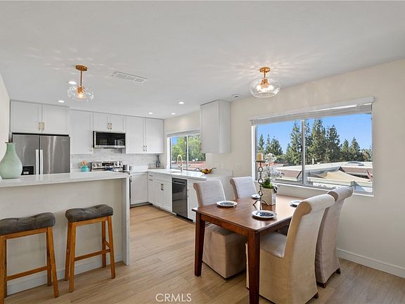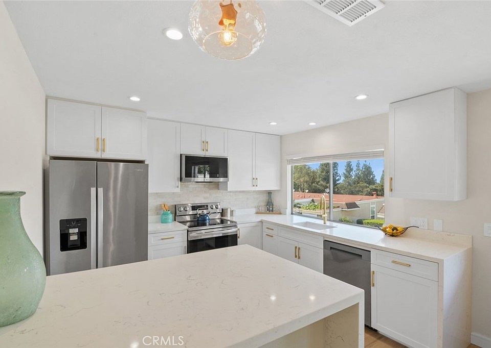 Do not use the unit number when planning directions. Fully remodeled end-unit townhouse in Laguna Hills filled with natural light and thoughtful design. This is the most desirable unit in the community, showcasing wide-plank light oak LVP floors, an open floor plan, and a striking mid-century modern steel fireplace that anchors the living space. The brand-new kitchen features white shaker cabinets with soft close, quartz counters with a waterfall edge, and a LG appliance package. Both bathrooms have been redesigned, including a primary suite with dual vanity, frameless glass shower, and a versatile built-in wardrobe. All bedrooms are on the same level, with a convenient laundry room right outside in the hallway.