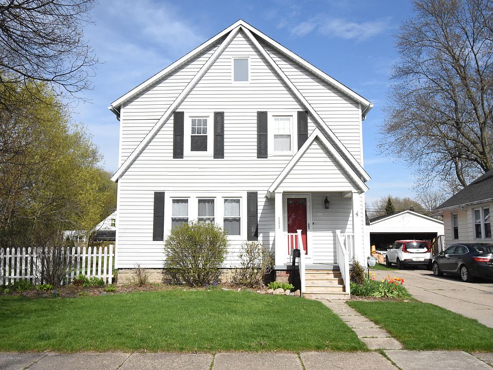 Step through the covered entryway and hardwood floors greet you in the expansive living room anchored with a stately brick fireplace & hearth. Pass through the arched doorway into the dining room with the original built in buffet. Past the dining room is a great flex room with a plethora of built-in shelving, closet and access to the backyard. The kitchen is equipped with a copious amount of cabinet and counter space, stainless appliances, a powder room and breakfast nook. The 2nd floor hosts three spacious bedrooms and a full bath. A ladder in the closet leads to a bonus loft space, complete with knotty pine paneling, three built in bed frames and skylights. The huge two car garage has plenty of room for your cars and storage space for all your tools & toys. The massive fully fenced back yard is a full double lot (included) and has perennial beds and playground equipment. New roof & furnace in 2011, new sump pump 2019, basement waterproofing system.