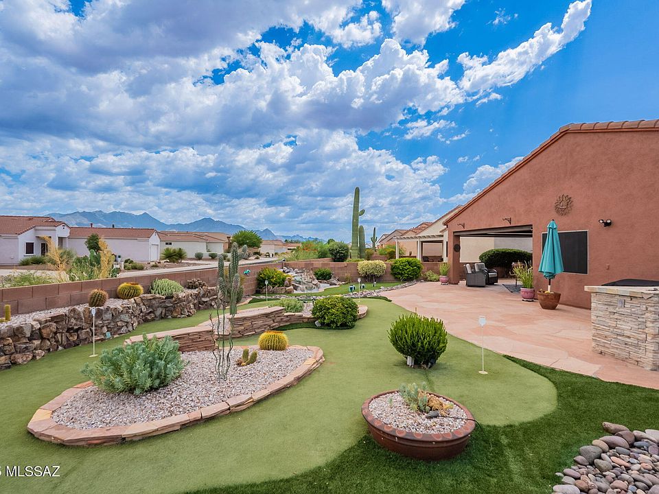A golfer's paradise w/5-hole putting green & Santa Rita Mtn views + Outdoor bar & waterfall fountain for entertaining in the beautifully landscaped backyard of this 1,421 sq ft 2 bedroom, 2 bath home located in a gated community, The Legends. Open concept kitchen, dining & living spaces w/celestial windows for extra light. Ample newer granite countertops & cabinets w/pull-outs. Pantry closet. Dining options include breakfast bar, dining area & outdoor dining on the extended flagstone uncovered & covered patio featuring pull-down screens. Primary bedroom suite w/walk-in shower & lg closet. 2-car attached garage features lighting for built-in workbench/storage + water softener. See improvements on SPDS. Green Valley living at its finest w/HOA pool & spa as well as GVR facilities nearby.