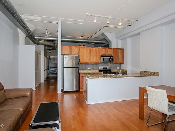 Do nothing and move right into this perfect starter home! A loft-style condo in McKinley Park overlooking the beautifully landscaped courtyard and public pool. This 1 bedroom + den unit features open concept living room with combined dining area. Prepare and cook a gourmet meal in this beautiful kitchen that features kitchen backsplash, granite countertops, and stainless steel appliances with extra under cabinet lightings. Laminated flooring throughout the unit and ample of functional space. Enjoy and relax on the front balcony. A secure-gated outdoor parking space is also included in the price. The unit also comes with an additional storage unit within the building. Conveniently located and within close proximity to Orange line, public transportations, McKinley Park Chicago park district, restaurants, grocery shops, Targets, I55 expressway, and so much more.