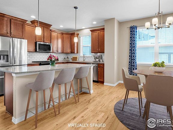 Highly desirable main-floor living with primary suite and bath, laundry, and a versatile office/flex room -- all on one level. This 4 bedrooms, 3.5 baths Boulder Creek Revel Three model offers a thoughtfully designed floor plan. Upstairs, find two guest bedrooms, a full bath, and a spacious loft, while the finished basement features a large great room, additional bedroom, and bath-perfect for guests or entertaining.Enjoy low-maintenance, energy-efficient living with beautiful natural light, soaring ceilings, and stunning upgrades throughout, including quartz countertops, plantation shutters, hardwood flooring, iron baluster stair railing, and upgraded lighting and hardware. The kitchen, dining, and living areas flow seamlessly, with a tankless water heater, surround-sound wiring, and internet access throughout for comfort and convenience. Relax on the back deck with a built-in gas line for grilling while overlooking the walking path and Ute Creek Golf Course. Complete with a 2-car attached garage, this meticulously maintained home is move-in ready.