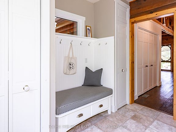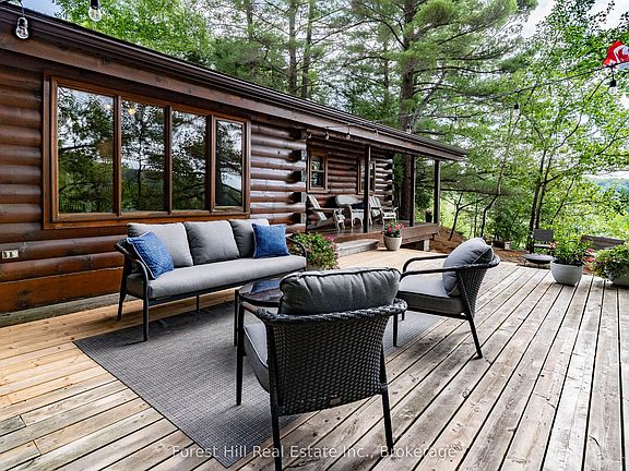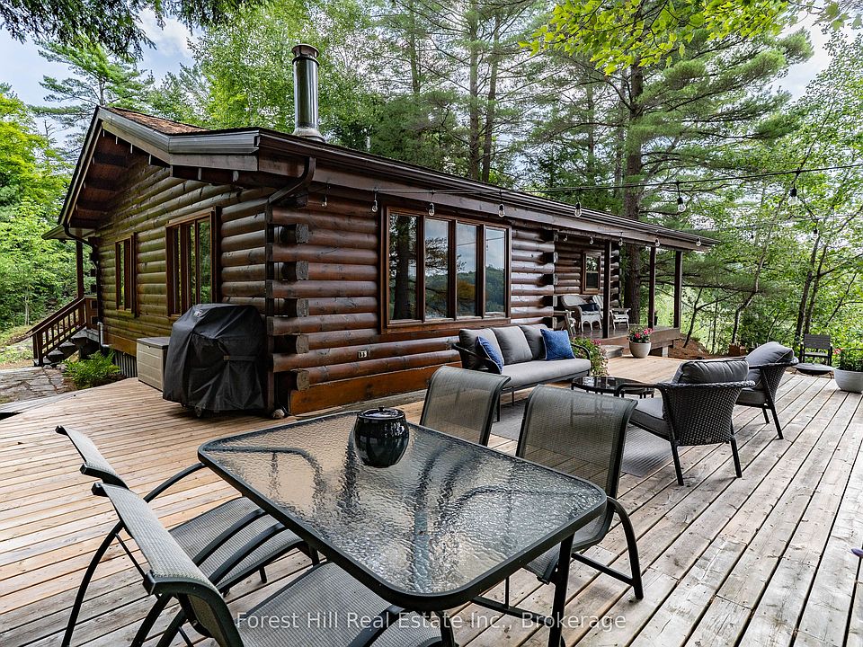 Super sharp, unique, immaculately maintained Nova Scotia pine scribe three bed log cottage or home. Century pines, western sunsets and breezes grace this relaxing peaceful private locale, majestically perched above fabulous crystal clear Skeleton Lake. The true essence of cottaging abounds, warm cozy character filled exposed post and beam interior with engineered hardwood floors. Lovely master suite with lake views and private deck. Great entertaining with the open concept kitchen, dining and living room space. There are two wonderful covered porches to escape the sun or take in a summer rain storm. A large newer lounge deck to marvel at the star filled dark sky night that Skeleton Lake is known for. Enjoy great deep water swimming and fishing from the fixed and floating docks at the shore, plus a dry boathouse/storage building for all the toys. There is a fun outdoor shower plus an additional storage building, comes furnished. Enjoy all four seasons at beautiful Skeleton Lake!