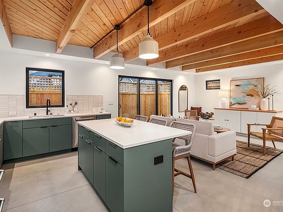 Boutique firm, Mint Build, presents this unique Tangletown new construction cottage. Custom slatted ceiling with exposed beams welcomes you into the open concept kitchen and living room. Kitchen includes Bertazzoni appliances and stunning matte quartz countertops. Main floor powder room makes space ideal for guests. Upstairs, find two suites with vaulted ceilings, plus laundry. Creative storage abounds with built-ins throughout the home, including custom-built under-stair slide out book shelf. Slider door leads to private turf and paver patio. Designated EV-ready off-street parking space included. Blocks to Green Lake for recreation, restaurants and shopping, plus access to Roosevelt and Wallingford neighborhoods also within minutes.