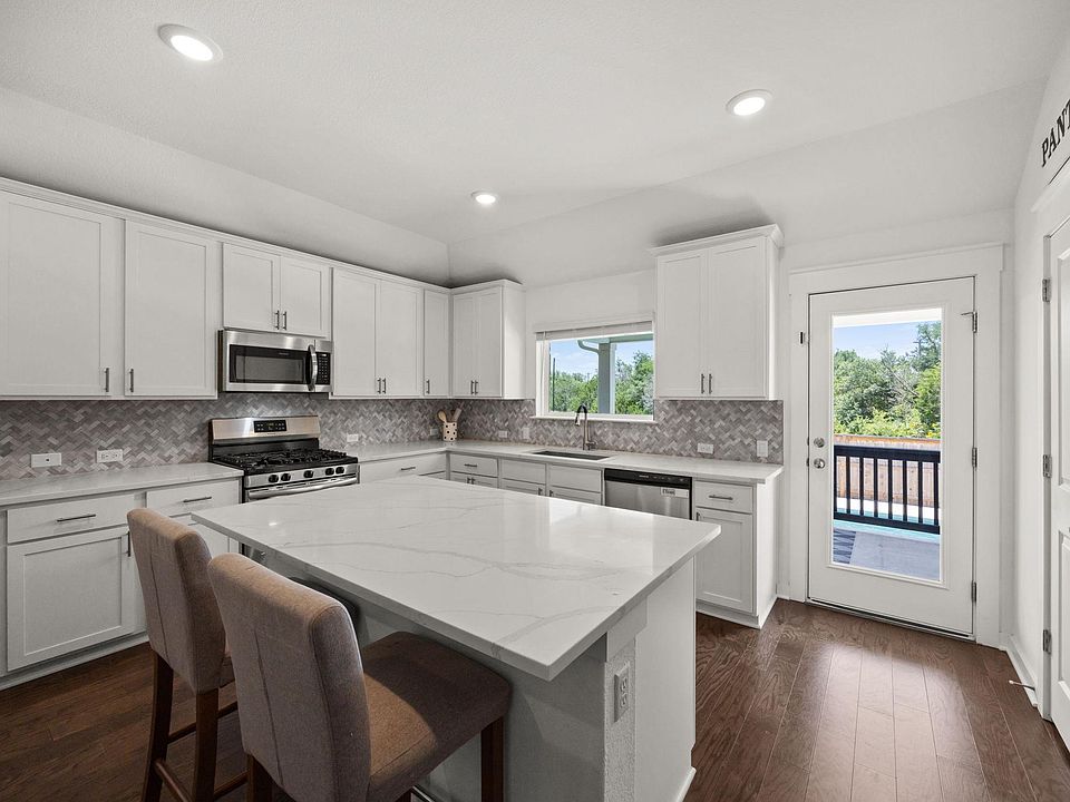 Stylish herringbone backsplashSleek white quartz countertopsCharming farmhouse sinkSparkling in-ground poolRich hardwood flooringLarge covered patioHigh-end finishes