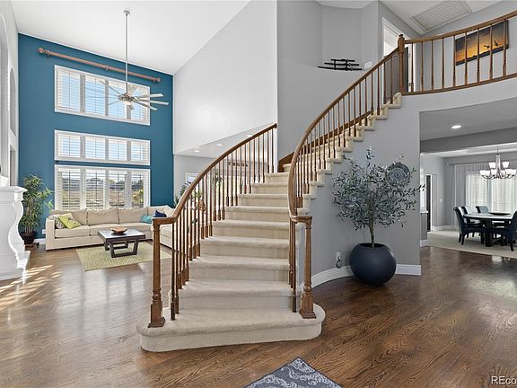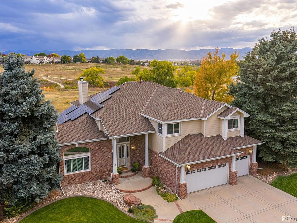 Ask Listing Agent how to save 1% off rate for the 1st year! Perfectly situated on premium lot backing to open space with stunning mountain views! A grand entry welcomes you into a light-filled open floor plan with high ceilings throughout, creating an immediate sense of elegance & space. The living room features soaring ceilings, cozy fireplace, & built-ins. A spacious kitchen with eat-in table space also opens to a formal dining room ideal for both everyday living & entertaining. A charming sitting room with its own fireplace & a private office with double doors & scenic views complete the main level along with a convenient half bath & laundry. Upstairs, the primary suite is a true sanctuary with a private deck, three-sided fireplace, & a five-piece ensuite bathroom with a soaking tub positioned to take in the mountain views. The expansive walk-in closet is a dream with abundant organized space. Two additional bedrooms each with their own ensuite bathrooms provide comfort & privacy, while the 4th bedroom is currently configured as an additional walk-in closet for primary suite. The finished basement features a large recreation room perfect for movie or game nights along with an additional bedroom & full bathroom. The backyard is newly landscaped for large gatherings with a stained stamped concrete patio with fire pit, three sub-irrigated raised garden beds, & a fully rebuilt two-story waterproof deck. Practical upgrades include a 9kW fully paid-off solar system offsetting about 85 percent of energy use, Tesla 80-amp EV charger, triple-pane ultra-efficient windows, new air conditioning, remodeled upstairs bathrooms, smart home technology, fresh interior paint with white trim & black doors, new oversized water heater, radon mitigation system, foam jacking to level walkways & driveway, upgraded downspouts, & a secure dog run. With a 3-car garage, spacious living areas, & breathtaking outdoor views, this home combines elegance & comfort in a truly remarkable setting.