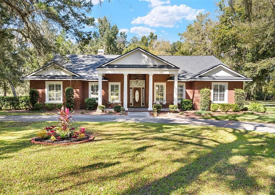 Situated on just under 10 acres, this incredible property is comprised of an executive-style pool home and a barn with workshop, affording an opportunity to enjoy luxurious country living, paired with the freedom to have your own horses, animals, toys and more! Upon entering through the iron gate, you will be impressed by this traditional brick construction home with front porch, stately columns, circle drive and side-loading 4-car garage. No detail was overlooked in its thoughtful design, which incorporates a functional floorplan, ample storage space, and flexibility to suit changing needs for years to come. Upon entering through the foyer, you will find formal spaces for dining and living, and will immediately notice upgrades including tray ceilings, crown molding, plantation shutters, transom windows, hardwood floors and more! At the heart of the home is a large family room with vaulted ceilings, wood-burning fireplace (which can be converted to gas) and french doors leading to the pool. A wonderful chef’s kitchen overlooks the living area, boasting granite countertops, wood cabinetry, upgraded stainless steel appliances (including double ovens, warming drawer and a vented hood), a closet pantry and a large kitchen island. An adjacent informal dining space provides extra seating and a convenient built-in desk. The primary suite includes a large bedroom with double tray ceilings, a private office with a large closet and an exterior door, two walk-in closets with built-in storage, and a spacious en-suite bathroom. With separate marble countertop vanities, a water closet with bidet, a walk-in shower with dual shower heads, a jetted tub, and access to the pool, the primary bath has it all. This split floorplan includes two bedrooms with en-suite bathrooms on the other side of the home. Each of these bedrooms has its own upstairs loft area, and one of the bathrooms is designed with a pocket door to provide dual function as a guest powder bath. If you need space for guests, the huge recreational room at the back of the home not only has overflow space for entertaining, with a wet bar, storage and refrigerator, but it also has a built-in murphy bed and yet another en-suite bathroom. The interior laundry room provides cabinetry for storage and a sink. The oversized garage has 50 amp electric service, and above the garage is a HUGE air-conditioned storage area, as well. A heated sports-style pool provides a fun place to enjoy the Florida lifestyle, with plenty of covered porch space to comfortably relax. Outside of the screened pool area, there is a paved pad for basketball hoops, a playset, and ample space for outdoor exploration. The entire permitter of the property is fenced, but in addition to this, the back yard has separate dog run, and there is fencing surrounding the barn, perfect for horses and other animals. The barn was constructed in 2014, with a 20x15 air-conditioned workshop, electricity, and plenty of room for your horses and animals under the remaining 36x20 covered space. With the ability to subdivide the 5 acres on this side of the property, you have endless opportunities for future use, making this a sound long-term investment and a place to grow for generations. This beautiful one-owner home has been lovingly maintained and is on the market for the first time since its construction. With a convenient location, large lot, and peaceful setting, this a truly a one-of-a-kind place to call home.