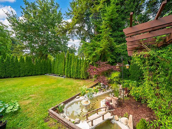 Soaring ceilingsHardwood floorsElegant millworkWok kitchenGlass showerSunny southwest backyardWater feature